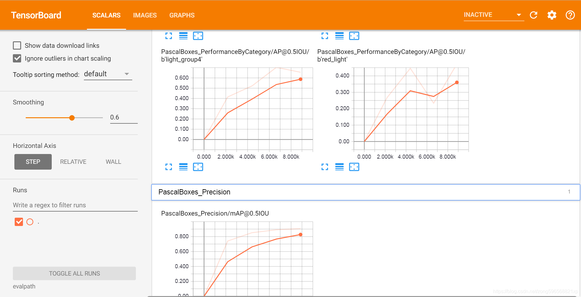 因此,遇到这些问题不要着急,训练的过程中一直等待就行。下图为我再tensorboard中监控到的结果,包括loss、各个类别的AP值,还有总的mAP值。在IMAGES选项中,还可
