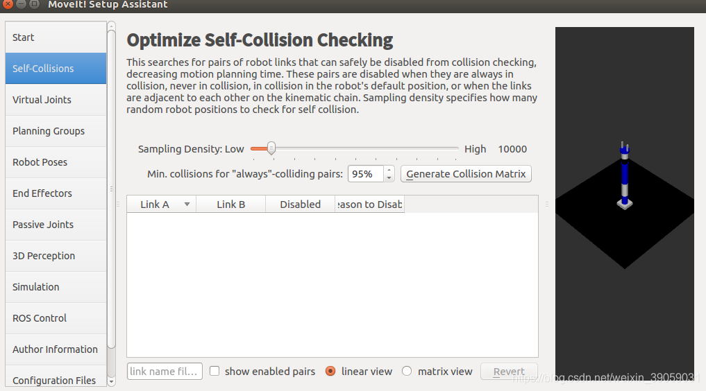 这样的话我们的第一步加载机器人模型就创建好了。   第二步我们需要去点击左边列表的第二个选项,主要是采样一系列的检测点,去检测机械臂的各各关节在运动的过程当中是否会发生碰撞,在这一步我们只需要去点击Generate Collision Matrix按钮就能够自动地去完成采样和计算,通过这样一系列的数据,我们在后面去做运动规划的时候,就可以提高运算的效率。