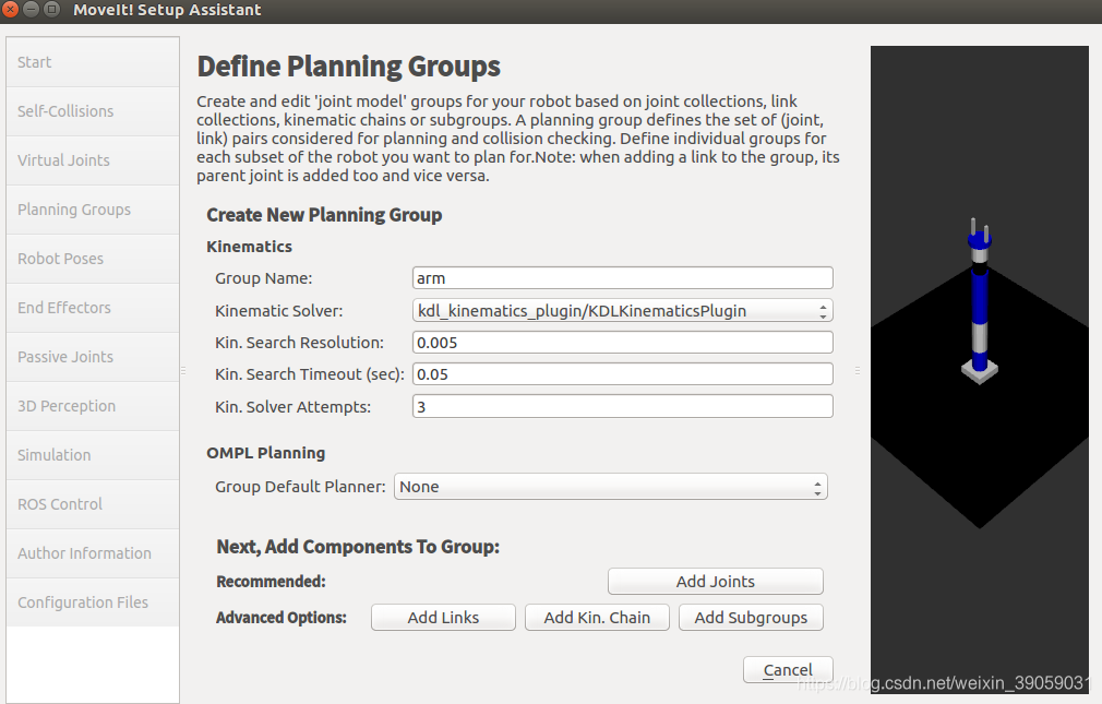 第三个步骤是虚拟关节,这个虚拟关节我们这里用不到,比如说我们需要将机械臂固定到一个底盘上面。这里的话我们直接跳过这里,到第四个步骤,运动规划组。   在这里我们可以去添加几个规划组,我们的控制都是通过规划组来控制的。比如说我们的机器人,我们可以将其分开成两个部分,一个是六轴机械臂的部分,另外还有一个就是夹爪的部分。那么我们可以将这两个部分分开,去配置相关的规划组。我们可以通过点击右下角的按钮来对其进行添加。第参数是规划组的名称、运动学求解器是什么、运动学求解器的基本参数。