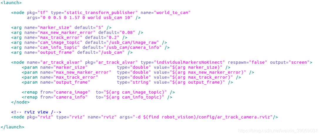 核心部分是node节点,通过启动individualMarkersNoKinect节点去识别二维码。里面加一些参数,像什么二维码的尺寸等。