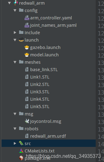 一旦机器人有超过6个关节,逆向运动学函数不唯一,可能存在多个解,逆向运动学很难,需要ROS中的逆向运动学包的使用,简化成矩阵的运算对于机械臂而言,需要的是能操作follow_joint_trajectory/joint_states接口的插件,需要用到两个插件, 分别用于从follow_joint_trajectory接受轨迹并产生控制的ros_control和对外发布joint_states数据的ros_joint_state_publisher。 仿真机械臂,首要的就是机器臂模型的URDF,不同于移动机器人的URDF,机械臂的仿真模型要重要的多,也需要更精确,这样才能便于控制的进行和效果的观察。在之前的redwall_arm包中继续添加文件,用于配置机械臂的模型参数,通过SolidWorks将三维模型的关节导出成STL格式,并保存到ros包的meshes目录,具体做法请参考https://blog.csdn.net/qq_34935373/article/details/88647161: