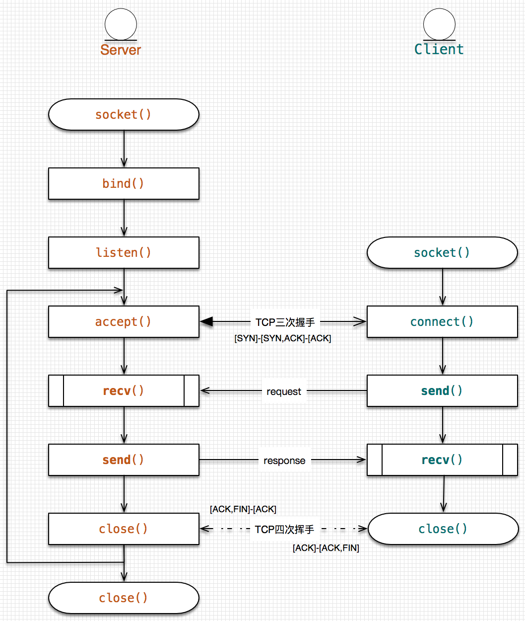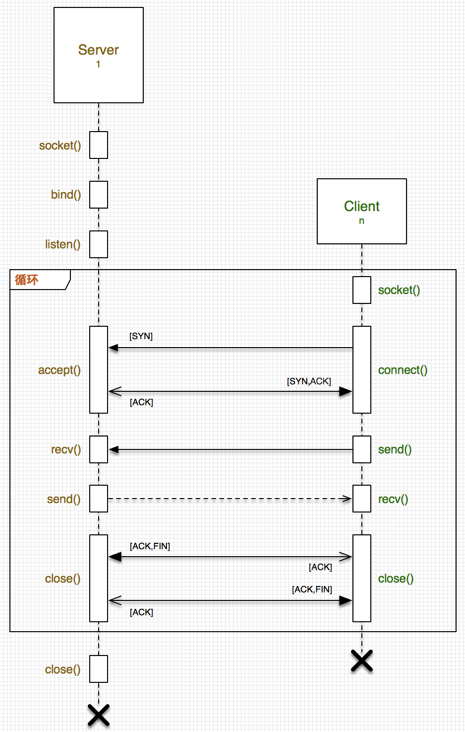 下图演示了从连接建立(connect-accept)到应答会话(recv-send)以及连接关闭(shutdown-close)的序列,借助 Wireshark 等抓包工具可进阶分析 API 调用背后的 TCP 协议栈机理。