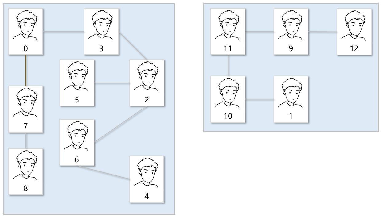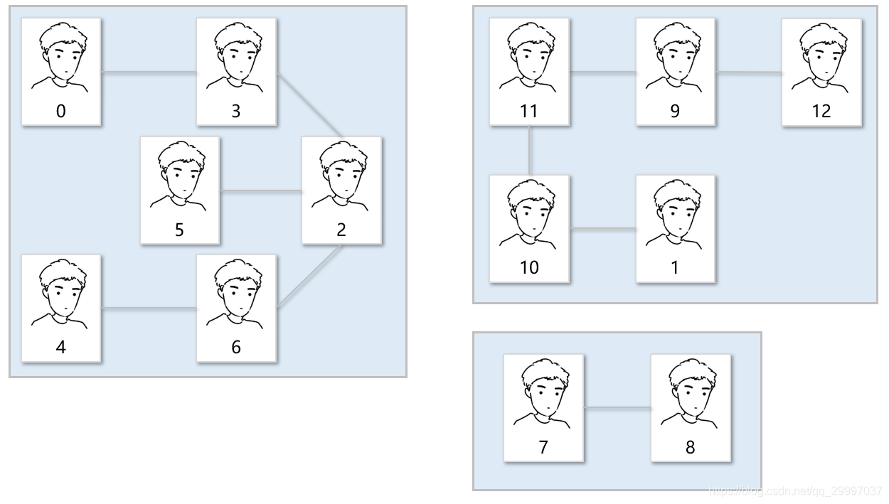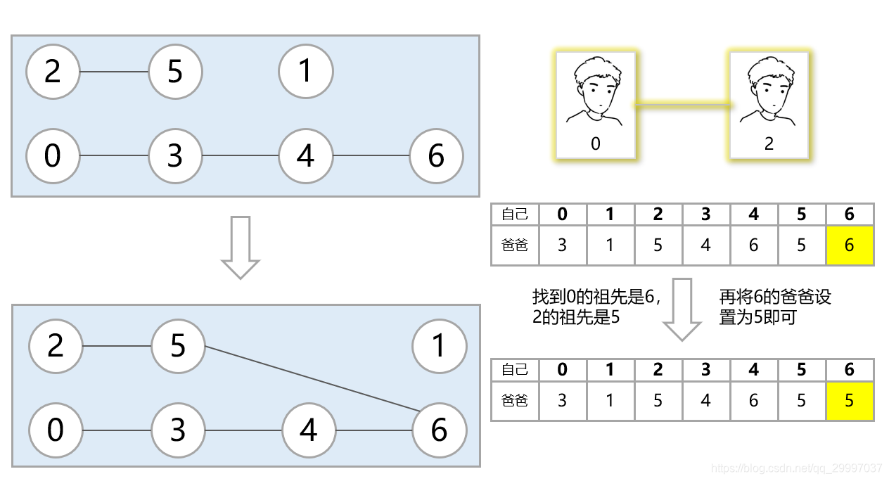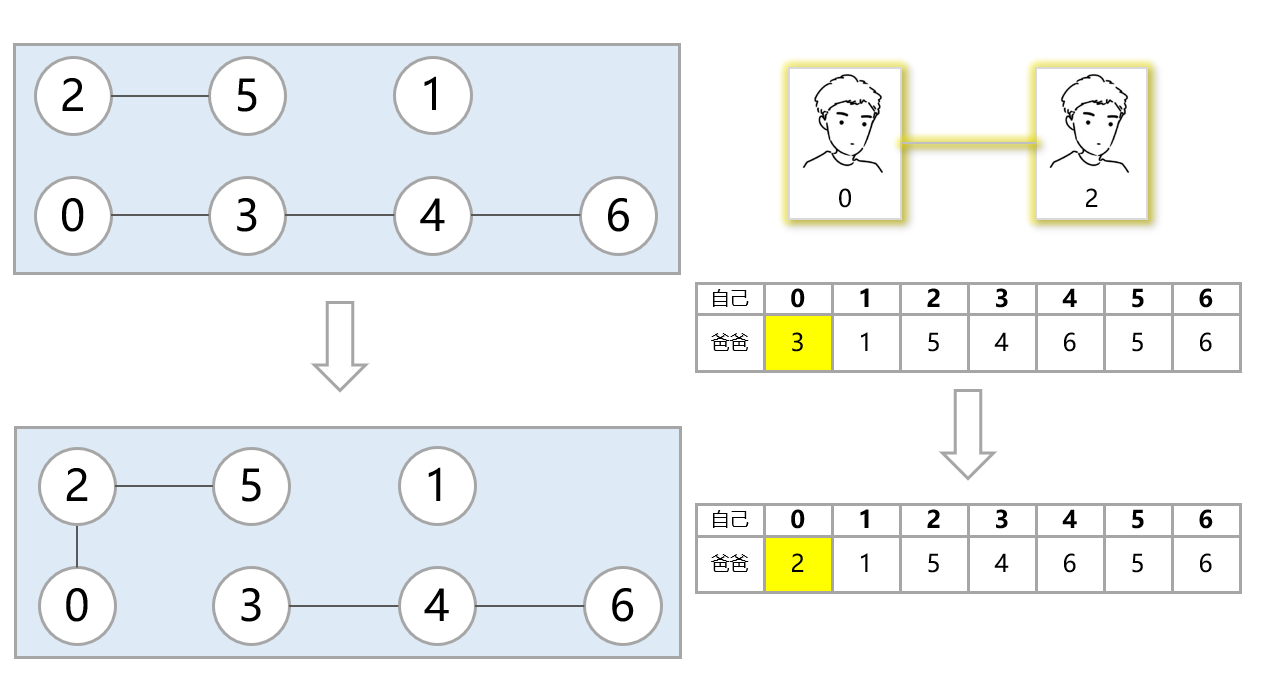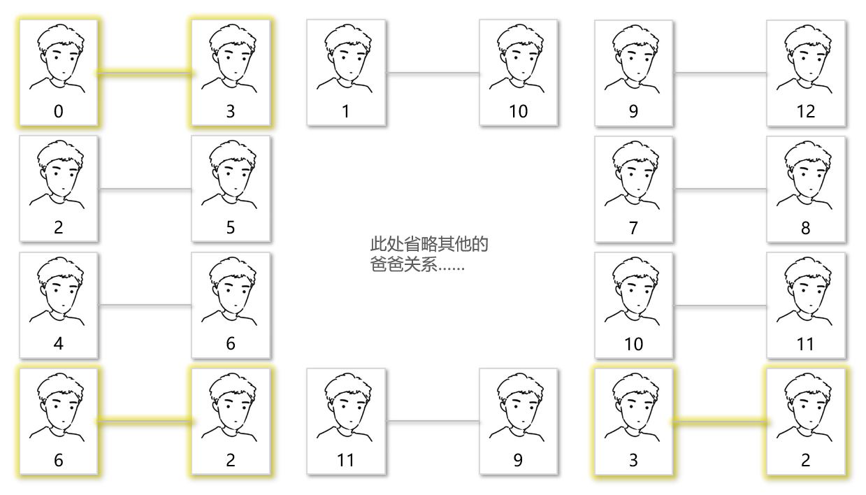 上图是宿管阿姨花了三天三夜整理的爸爸关系图,宿舍楼里总共有n个男生,所以她将每个男生编号0~(n-1)。刚开始人不多,所以阿姨想看0和6是不是一个家族的,只需要看这几个关系即可知道0和6是一个爸爸家族的