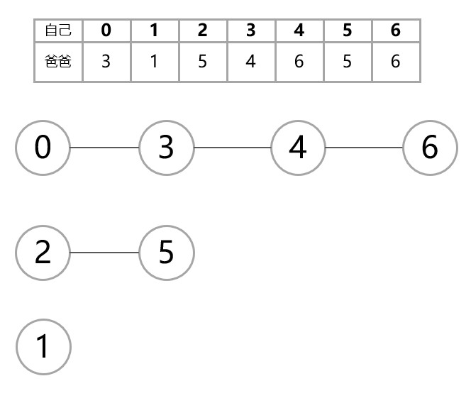 我们要查找0和4是不是一个家族的,就需要查看0的祖先和4的祖先是同一个人吗?换句话说也就是只需要向上依次查询0的爸爸的爸爸的爸爸,查询4的爸爸的爸爸的爸爸,直到最后的爸爸的爸爸是他自己,就说明这个是爸爸家族里的祖先。下面给出图示说明