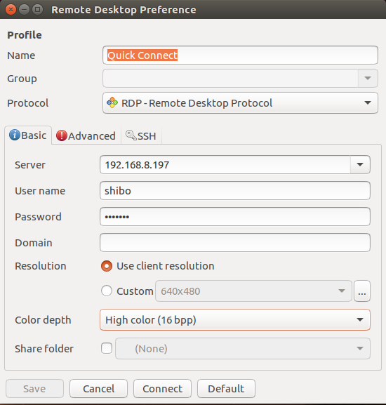 点击New,添加设备,color depth建议选择high color(16bpp),然后点击连接